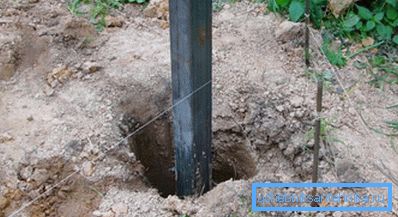Sada morate otopiti pijesak beton vodom, omotati dio stupova koji "idu" u zemlju, krovni materijal, a zatim umetnite ekstremne stupove u jamu. Tada ih morate poravnati u odnosu na vertikalu s razinom i popuniti slobodni prostor rupa betonom.
