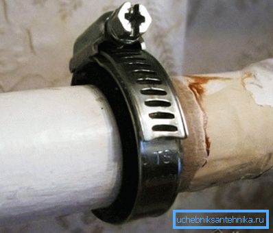 Obratite pažnju! Ako je problem složen, možete upotrijebiti metalni popravak. Postavlja se na podstavu guste, izdržljive gume. Ovaj element održava visoku razinu pritiska u tlačnoj mreži za vodu. S nepropusnim kanalizacijskim cjevovodom, spojnica se može nositi bez ikakvih problema.