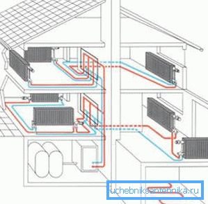 - Dvocijevni - u ovom slučaju, vruće rashladne tekućine i povratni tok se prevoze kroz različite cijevi. Unatoč činjenici da dvotapni projekti sustava kućnog grijanja podrazumijevaju veću potrošnju cijevi, oni su češći jer osiguravaju ravnomjerno zagrijavanje radijatora bez obzira na podnu površinu (pod uvjetom da je ispravno izračunata snaga).