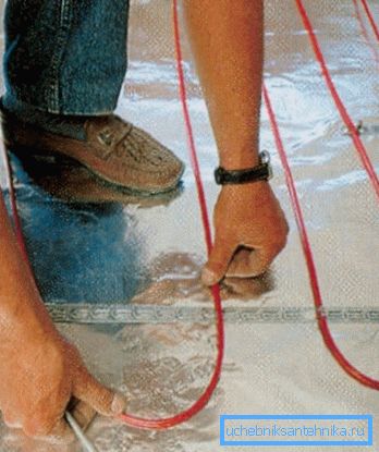 - Kabelske podove fiksiramo na pod pomoću posebnih spojnica za pričvršćivanje i pričvrstimo ih na električnu mrežu. Istodobno osiguravamo da integritet izolacije nije ugrožen na kabelskim priključcima.