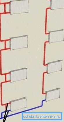 U sustavu s jednim cijevima, baterije su spojene u seriju. Ove sheme za povezivanje radijatora u zgradi najčešće se koriste. Očite prednosti ovdje su jednostavnost instalacije i relativna jeftinost projekta.