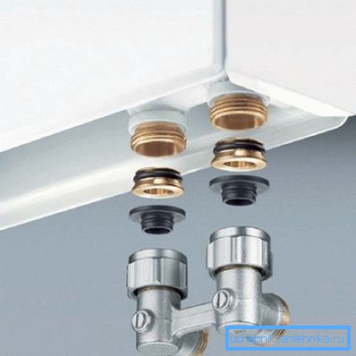 - Spajanje čeličnih radijatora s donjim priključkom napravljeno je kako slijedi: prvo, elementi su pričvršćeni na radijator, nemojte zaboraviti staviti posebne podloške koji brtve spoj. Potrebno je jako čvrsto stegnuti sve čvorove, ali ne biste trebali biti previše gorljivi jer možete razbiti maticu.