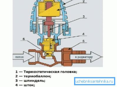 Kao ventil za vijak, termostatski ventil uključuje kretanje medija kroz svoje tijelo samo u jednom smjeru: rashladna tekućina mora prijeći samo do sedla i isključivo odozdo. Smjer kretanja rashladnog sredstva uvijek je označen strelicom na tijelu.
