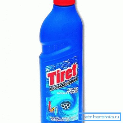 - Zatim u odvodnu rupicu morate uliti ili napuniti kemijsko sredstvo, na primjer, "Mole", "Mr. Muscle", "Tiret" ili drugi. Cijena ovih sredstava je u pravilu približno jednaka, kao i učinkovitost.