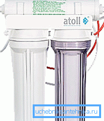 Nastavljajući temu, kakav se vodeni filtar odabire ispod sudopera, treba reći da se stupanj zaštite može povećati povećanjem broja tikvica ili stupnjeva, na primjer, uređaja s dvije tikvice. Prva mehanička patrona drži čestice veličine 10-30 mikrona, a druga tikvica sadrži uložak za naknadnu obradu ugljika (prah ili granulirani aktivni ugljen).
